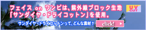 これらの大敵をシャットアウトすることが、最も経済的で簡単で確実な美肌への早道なのです。 フェイス on ワンピ.(かおわんぴ)に使われている生地は、紫外線ブロック効果の高い「サンダイヤドライコット」を使用。高級光触媒繊維「サンダイヤ」と吸汗・速乾性に優れたコットンを紡いだ素材で、上記機能に加えて抗菌・防臭・汚れの分解にも優れています。